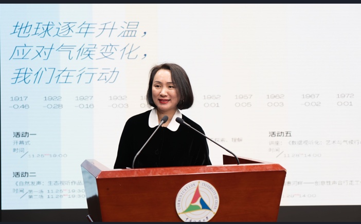开幕式最后,艺术周活动总导演、发起人张谦副教授介绍了项目团队和创作过程,以及她作为基层一线研究生导师对于如何培养专业学位硕士研究生的种种体会。她谈到,由她本人和贲小龙、李惠子、冯金硕等人组成的指导教师团队,积极发挥学院在音乐与录音专业方面的特长,引导学生实地运用全景声录音技术和科学数据音乐化等手段,创造性地将气候变化转化为音乐和声音作品,并通过沉浸声和视觉化手段将其呈现出来,这不仅促进了科学与艺术之间的跨界融合,还激发了学生的创造力和实践能力。