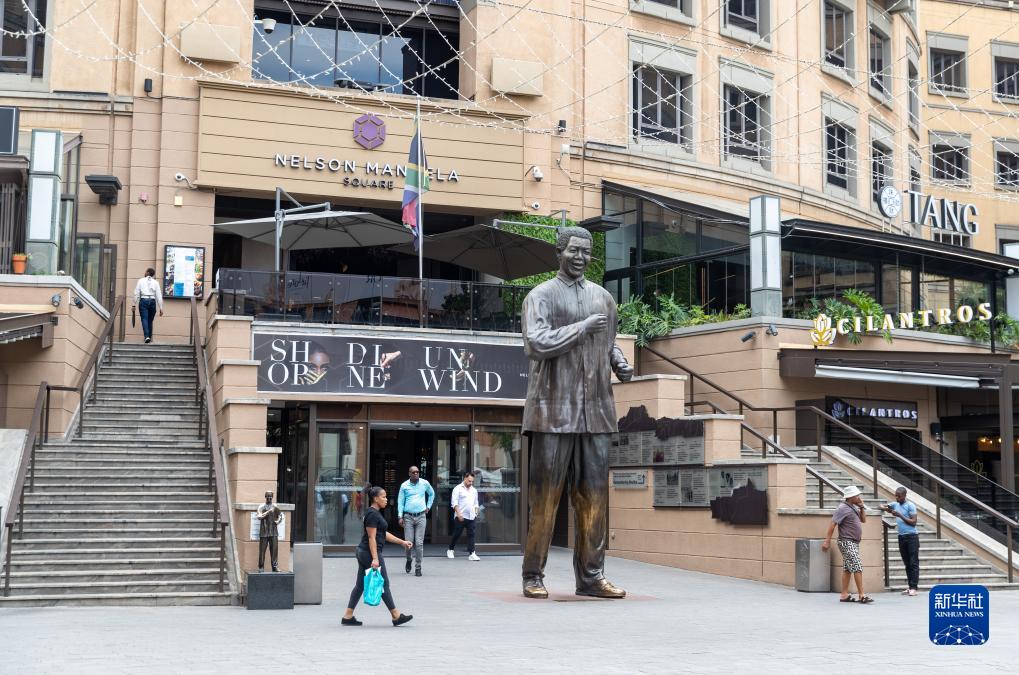 12月5日,在南非约翰内斯堡曼德拉广场,人们走过曼德拉铜像。