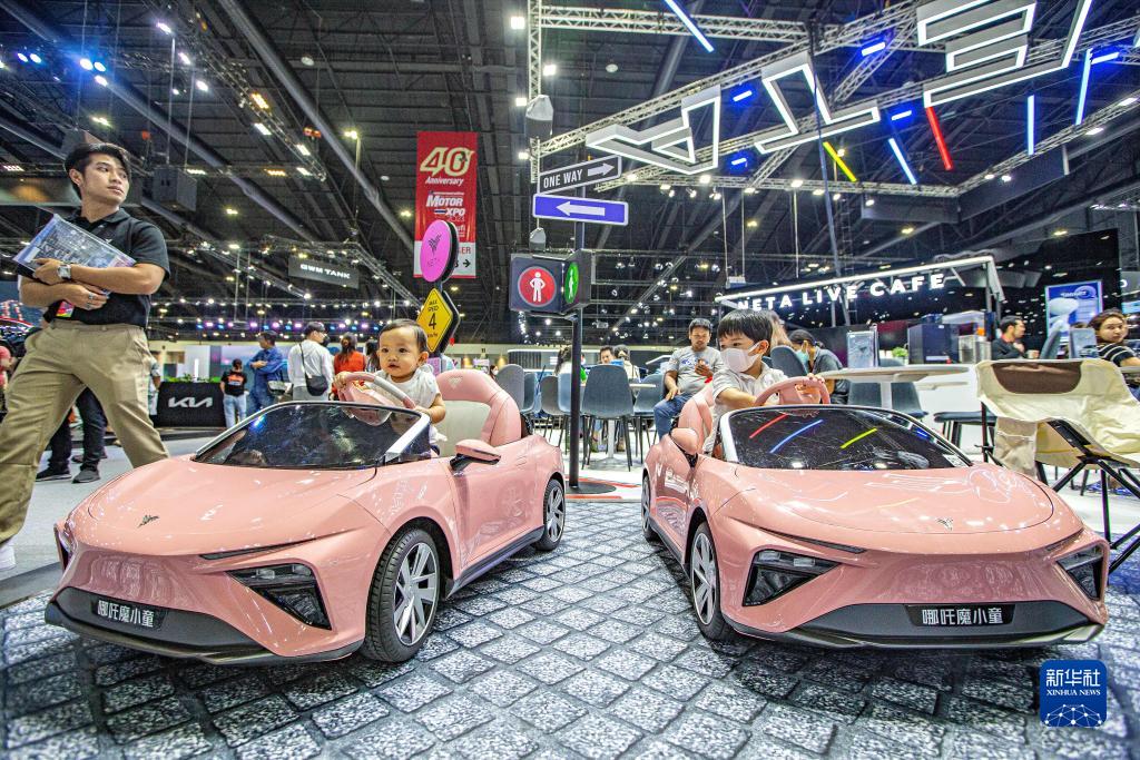 12月6日,儿童在曼谷举行的泰国国际车展上体验哪吒魔小童童车。新华社记者 王腾 摄