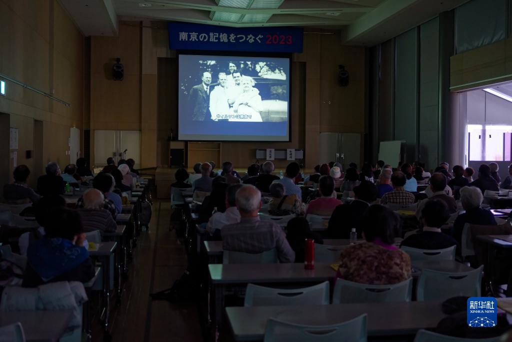 12月9日,在日本大阪,参会人员观看介绍美国医生罗伯特·威尔逊的纪录片。影片讲述了南京大屠杀期间,威尔逊冒着战火全力抢救中国受难民众的故事。新华社记者 张笑宇 摄