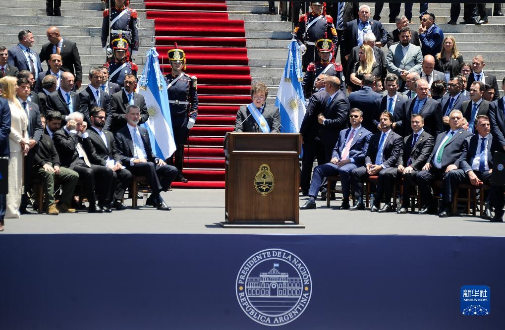 12月10日,在阿根廷布宜诺斯艾利斯的国会广场,阿根廷新总统米莱(中)在就职仪式后发表演讲。