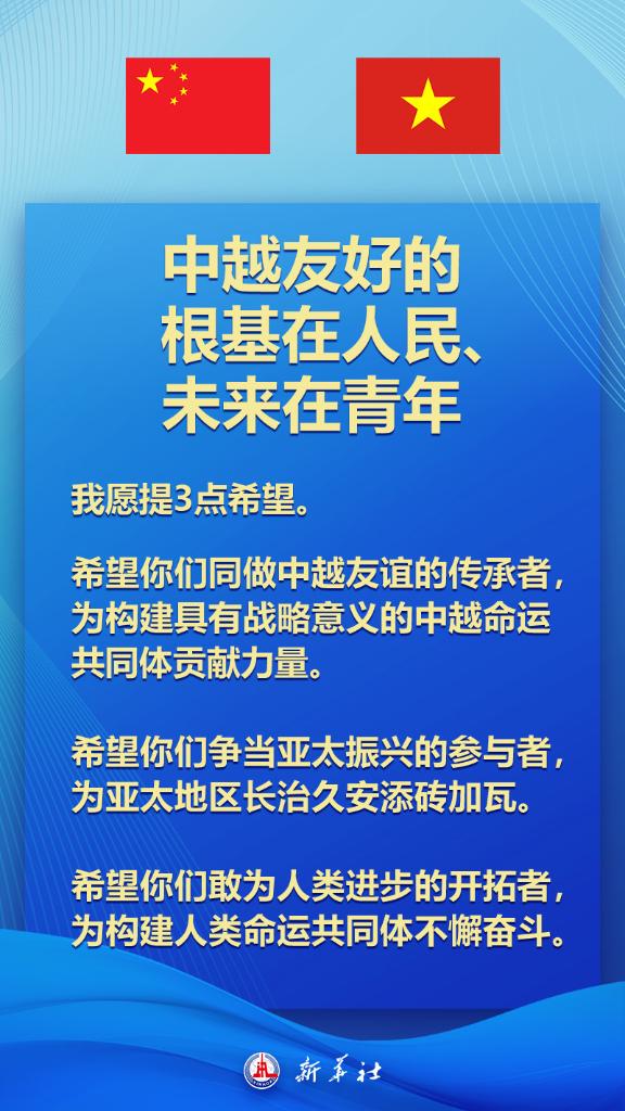 当地时间12月13日下午,中共中央总书记、国家主席习近平和夫人彭丽媛在河内同越共中央总书记阮富仲夫妇共同会见中越两国青年和友好人士代表。