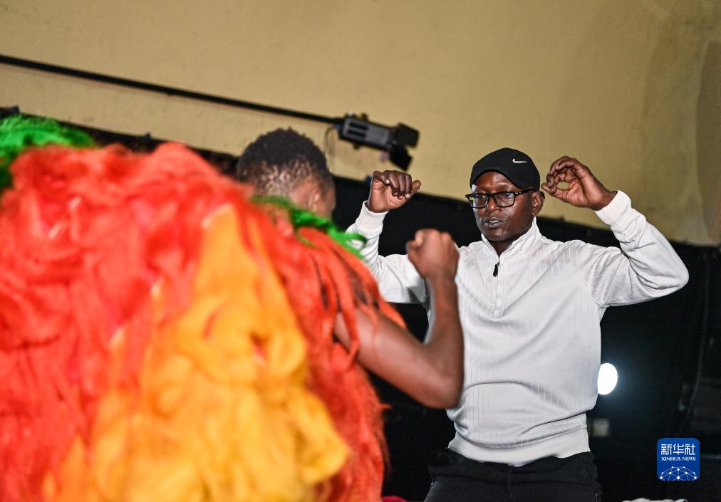12月4日,在位于肯尼亚首都内罗毕的内罗毕杂技艺术剧院内,马蒂亚斯(右)指导学生练习舞狮。