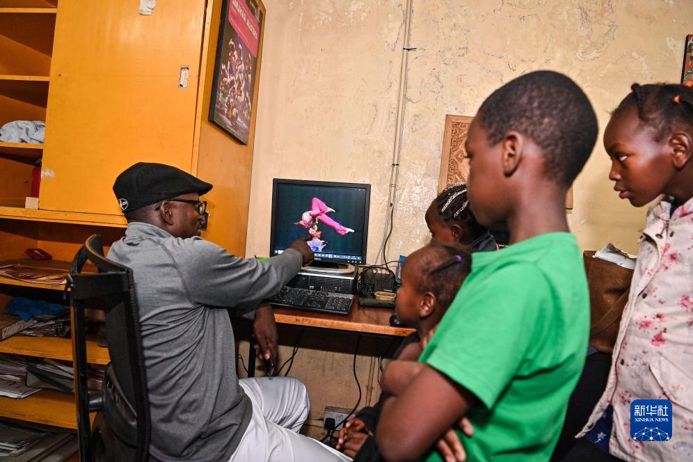 11月18日,在位于肯尼亚首都内罗毕的内罗毕杂技艺术剧院内,马蒂亚斯(左)在办公室内向他的儿童学生展示自己1985年在中国表演杂技的录像。