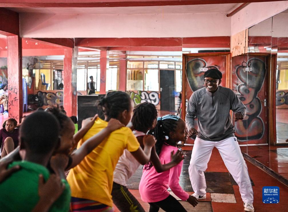 11月18日,在位于肯尼亚首都内罗毕的内罗毕杂技艺术剧院内,马蒂亚斯带领儿童学生跳舞。