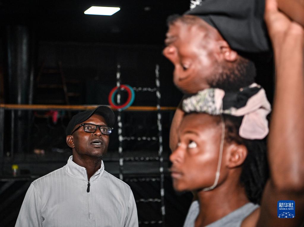 12月4日,在位于肯尼亚首都内罗毕的内罗毕杂技艺术剧院内,马蒂亚斯指导学生练习头顶人倒立。