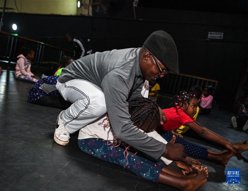 11月18日,在位于肯尼亚首都内罗毕的内罗毕杂技艺术剧院内,马蒂亚斯指导儿童学生拉伸。