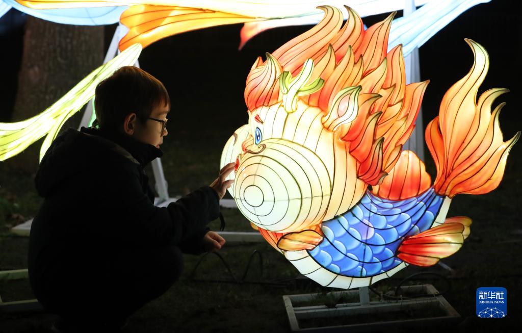 12月14日,一名男孩在法国巴黎风情园举办的“山海有灵”法国豫园灯会上参观。