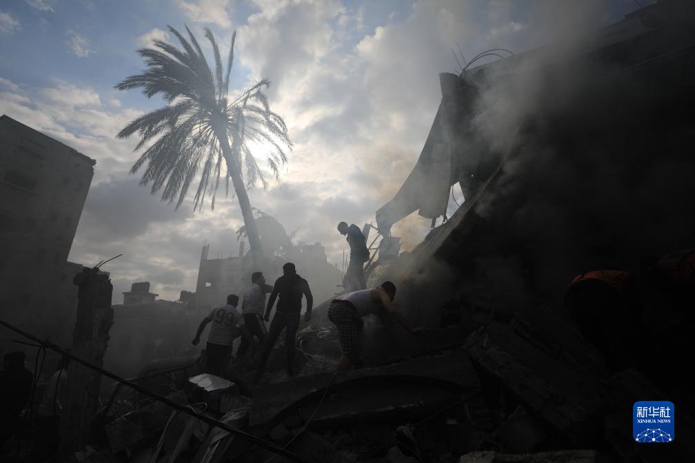 12月14日,在加沙地带南部城市拉法,人们在以军空袭后的建筑废墟上开展救援。