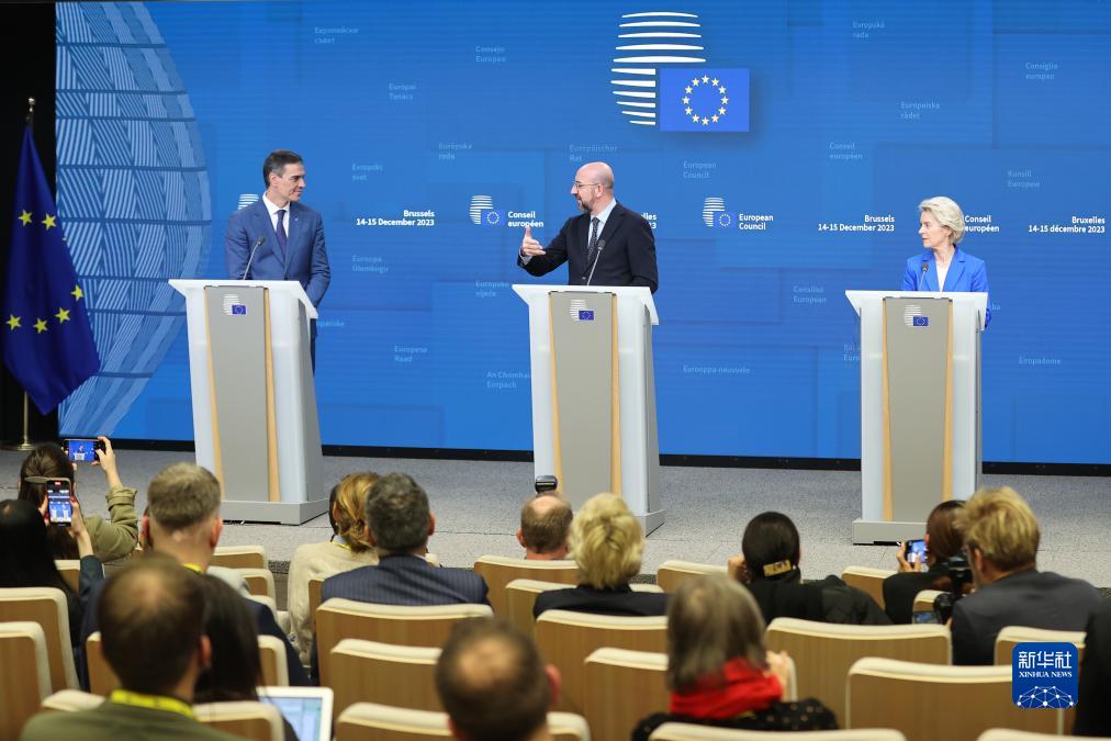 12月15日,在比利时布鲁塞尔,欧洲理事会主席米歇尔(中)、欧盟委员会主席冯德莱恩(右)、西班牙首相桑切斯在欧盟峰会期间出席新闻发布会。新华社记者 赵丁喆 摄