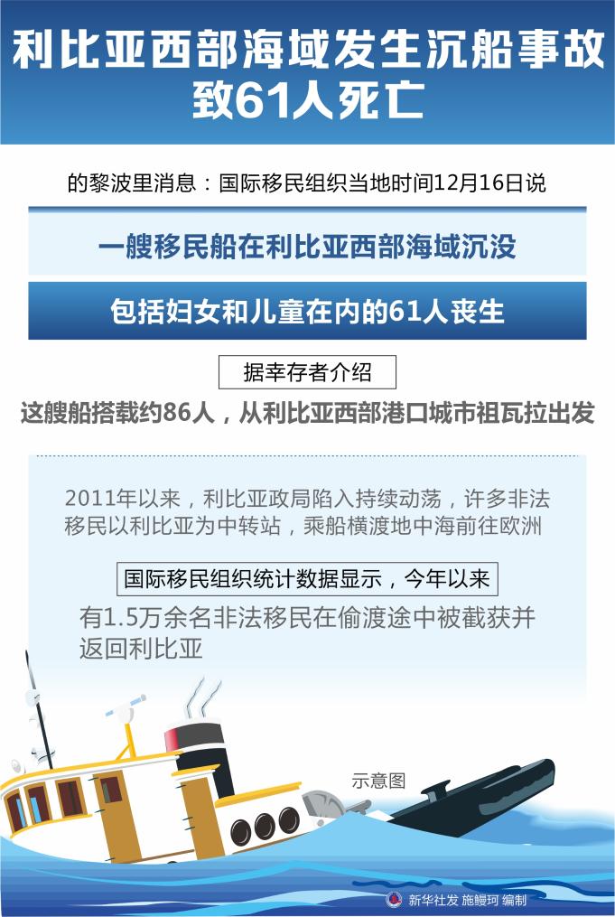 新华社突尼斯12月16日电(记者潘晓菁)的黎波里消息:国际移民组织16日说,一艘移民船在利比亚西部海域沉没,造成61人死亡。