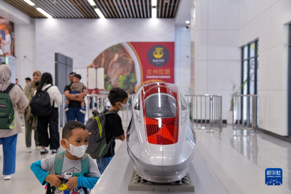 12月17日,在印度尼西亚雅加达哈利姆站候车大厅,小朋友观看雅万高铁高速动车组模型。