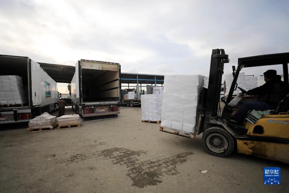 12月17日,工作人员在凯雷姆沙洛姆口岸加沙地带一侧卸载人道援助物资。