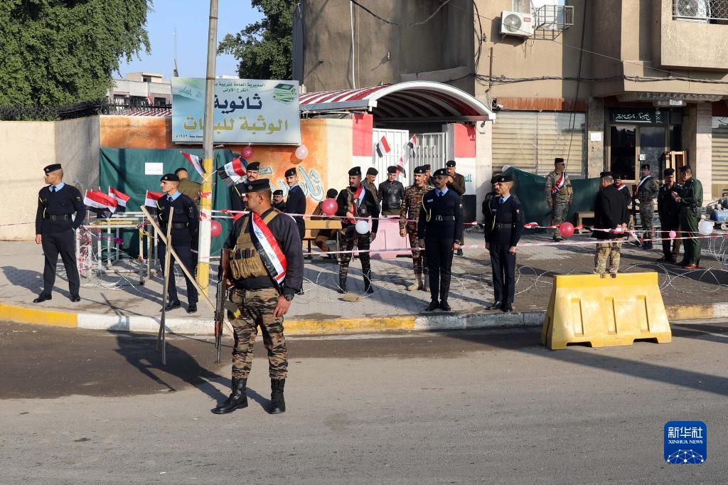 12月18日,安全人员在伊拉克巴格达一处投票站外警戒。