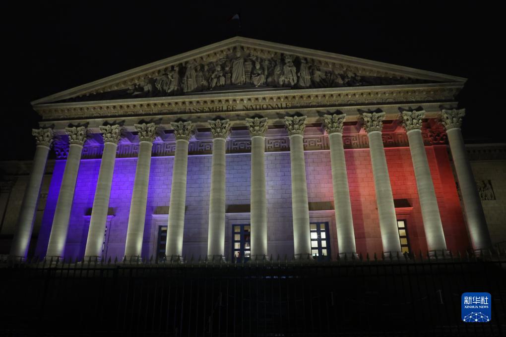这是12月19日在巴黎拍摄的被红白蓝三色彩灯点亮的法国国民议会。