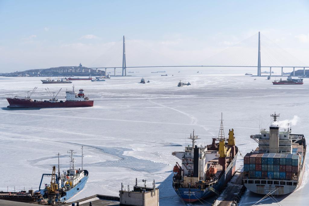 这是2023年1月24日拍摄的俄罗斯符拉迪沃斯托克金角湾冰冻的海面。新华社发(郭飞洲 摄)