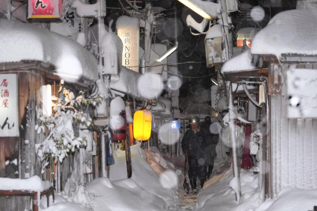 2022年12月23日,行人在日本石川县金泽市冒雪前行。新华社/共同社