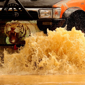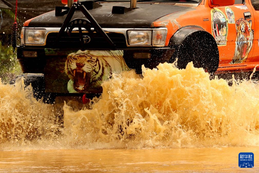 12月27日,在泰国南部北大年府,一辆汽车在被水淹没的道路上涉水前行。