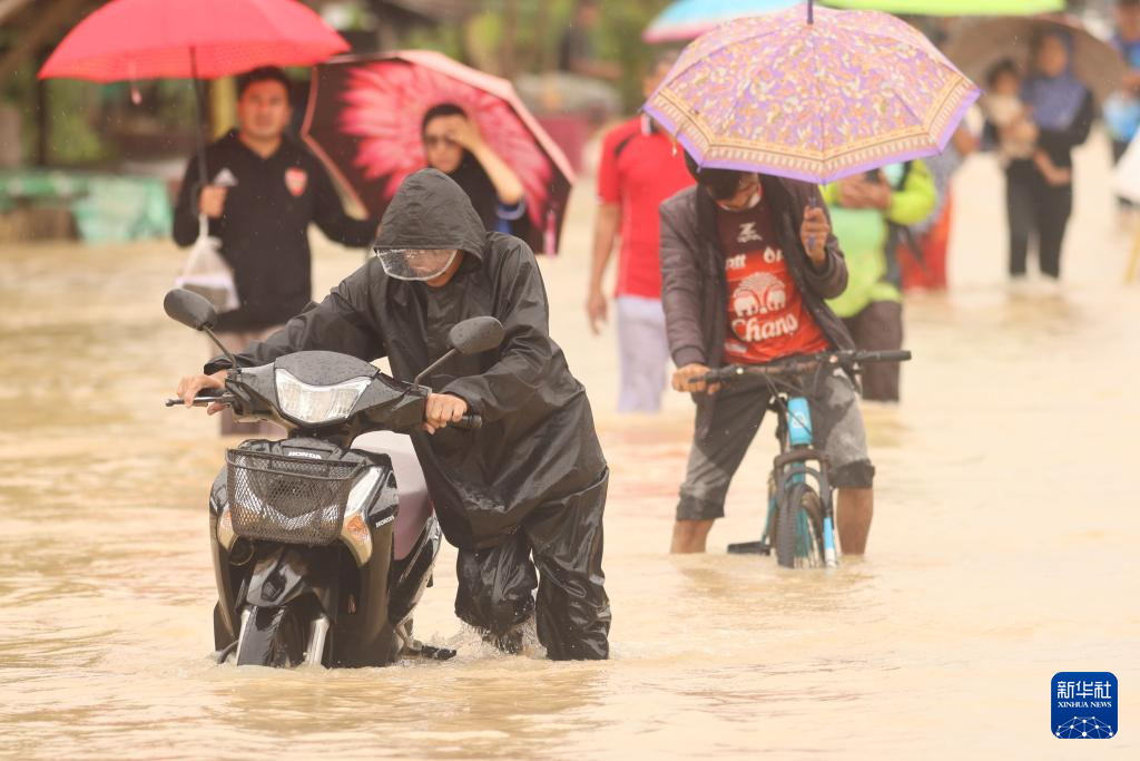 12月25日,在泰国那拉提瓦府,人们在被水淹没的道路上涉水前行。