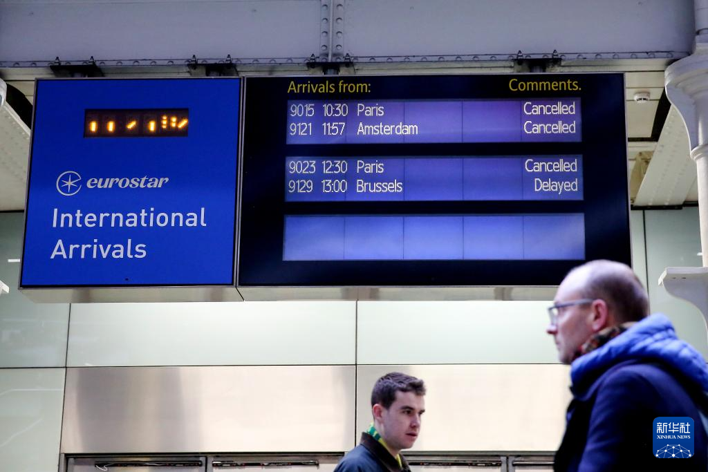 12月30日,旅客经过英国伦敦圣潘克勒斯火车站内显示“欧洲之星”列车取消和推迟信息的电子显示屏。