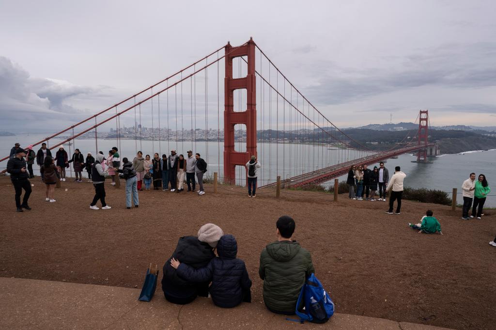 2023年12月31日,在美国旧金山金门大桥附近,人们欣赏2023年最后一缕夕阳映照下的景色。新华社发(李建国摄)
