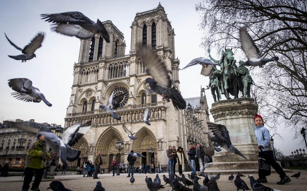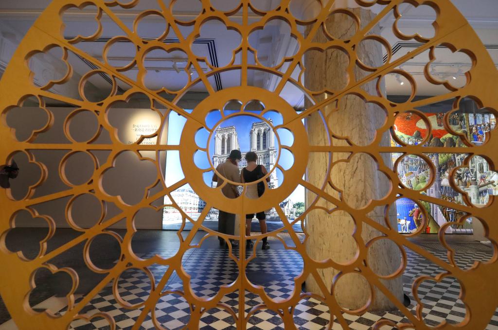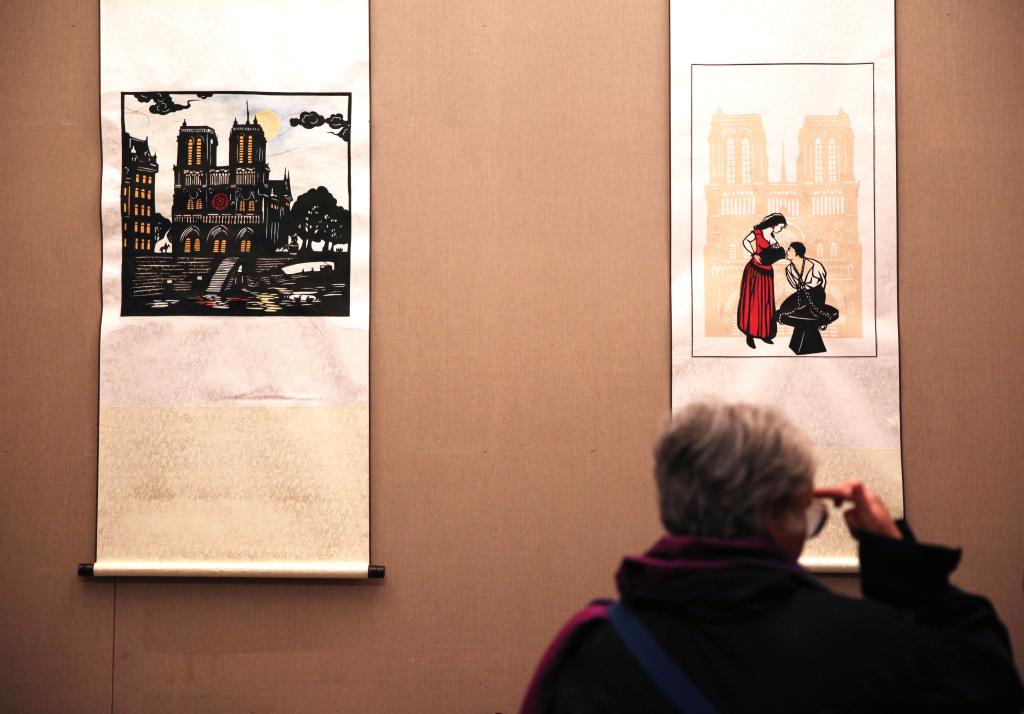 ↑2019年,在法国巴黎中国文化中心举行的“璀璨云南,魅力非遗——中国云南省非物质文化遗产作品展”上,参观者欣赏以巴黎圣母院为主题的剪纸作品。