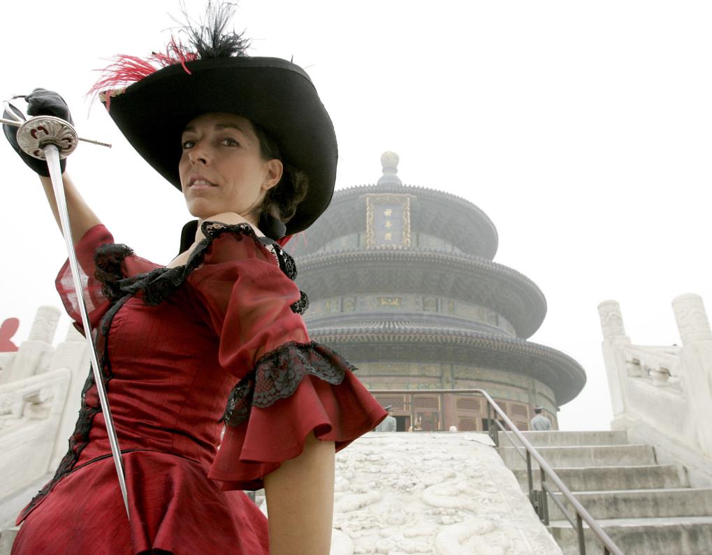 ↑2004年,法国“塞纳河之剑”表演团的一位女“剑客”在天坛祈年殿前举办的“中法击剑精英赛”上亮相。