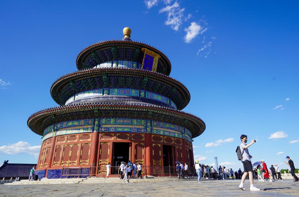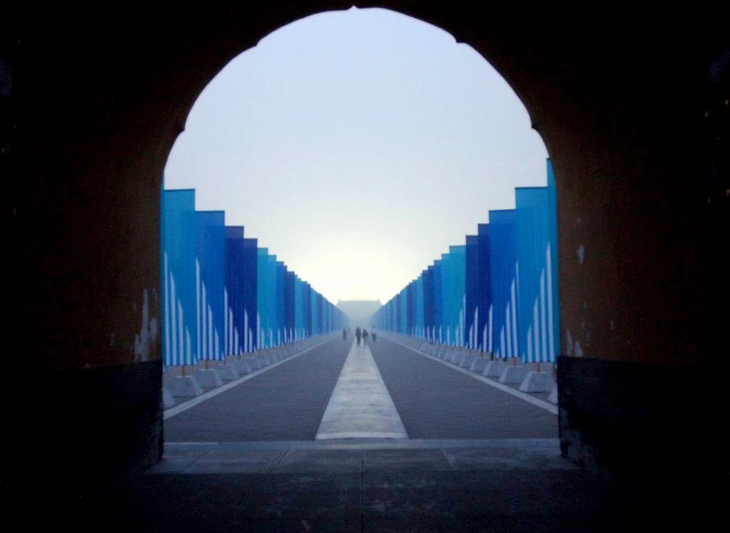 ↑2004年,法国著名当代艺术家丹尼尔·布伦在天坛祈年殿前的主甬道两旁布置了用时一年创作的“从天空到天坛”。该作品由230个高5米的5种蓝色调旗子组成。