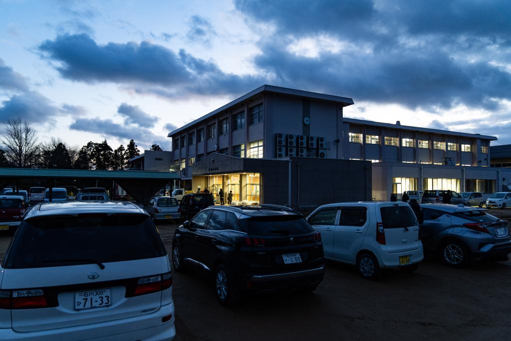 ↑1月2日,在日本石川县志贺町的志贺町立富来小学,居民将汽车停在小学操场在小学内避难。