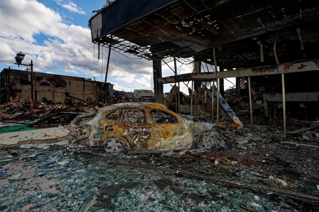 ↑1月4日,在日本石川县轮岛市“轮岛早市”上拍摄的被烧毁的大楼,记者便是从这里爬上顶楼。