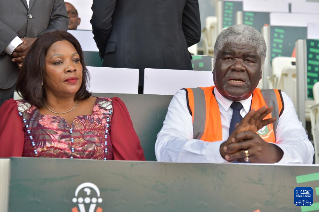 1月5日,科特迪瓦总理芒贝(右)在视察位于圣佩德罗市的圣佩德罗体育场时讲话。