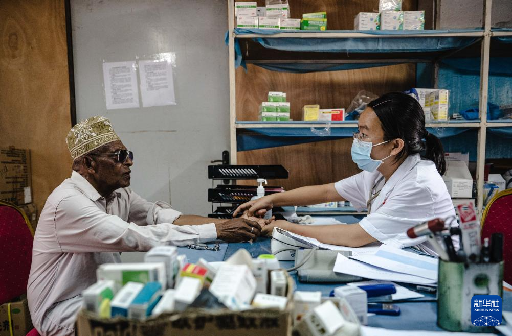 1月11日,中国第15批援科摩罗医疗队中医康复科医生彭跃文在位于科摩罗首都莫罗尼的马鲁夫医院内为患者看病。