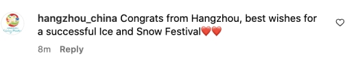 杭州账号在冰雪节开幕的帖文下方留言:来自杭州的祝福,祝愿冰雪节举办顺利。