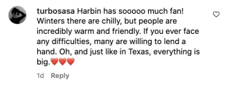 “夸夸团”的粉丝里不乏身在海外的哈尔滨人,在看到家乡的“出圈”后骄傲感油然而生,直接在帖文下自报家门。