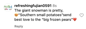 福建账号在大雪人视频下方留言:大雪人好漂亮,“南方小土豆”把最好的爱送给“大冻梨”。