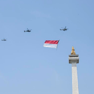 2023年8月17日,悬挂印度尼西亚国旗的飞机编队飞过首都雅加达的民族独立纪念碑上空。新华社发(祖卡南 摄)