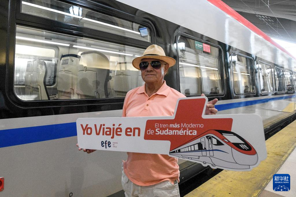 1月19日,在智利圣地亚哥中央车站内,一名乘客举着“我乘坐了南美洲最现代列车”的标语与列车合影。
