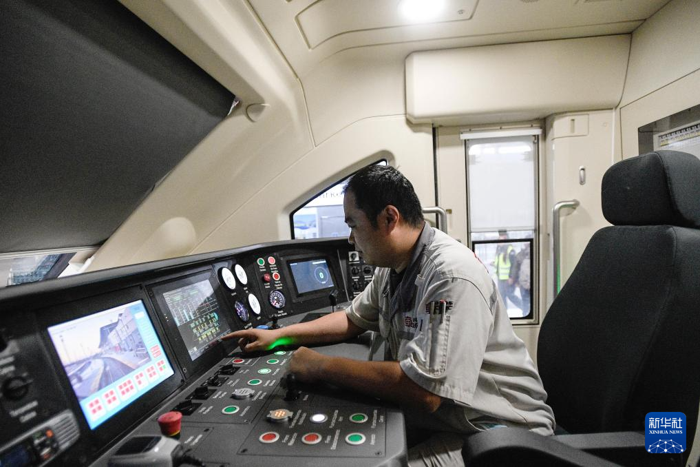 1月19日,在智利圣地亚哥中央车站,中车四方技术人员在电力内燃双动力动车组驾驶室内工作。