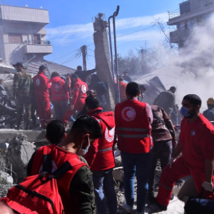 1月20日,叙利亚首都大马士革西部迈宰地区一栋多层住宅楼遭袭,救援人员来到现场救援。