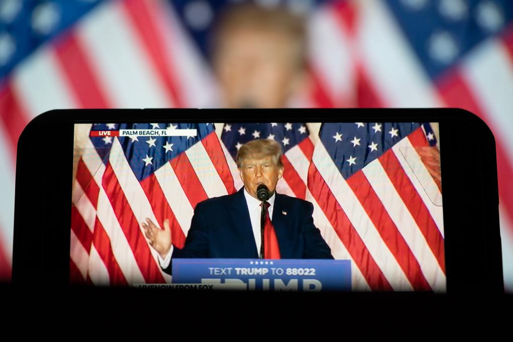 2022年11月15日拍摄的电子屏幕显示,美国前总统、共和党人特朗普在佛罗里达州的海湖庄园发表讲话。新华社记者刘杰摄