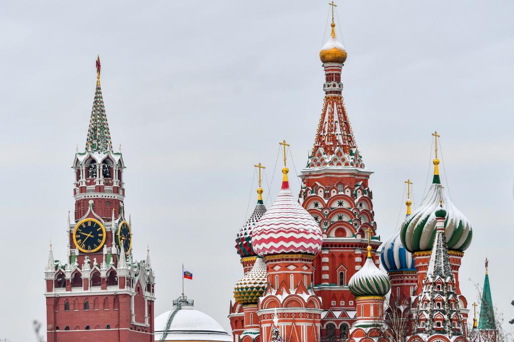 这是1月6日在俄罗斯首都莫斯科拍摄的雪后克里姆林宫(左)和圣瓦西里教堂。新华社记者曹阳摄