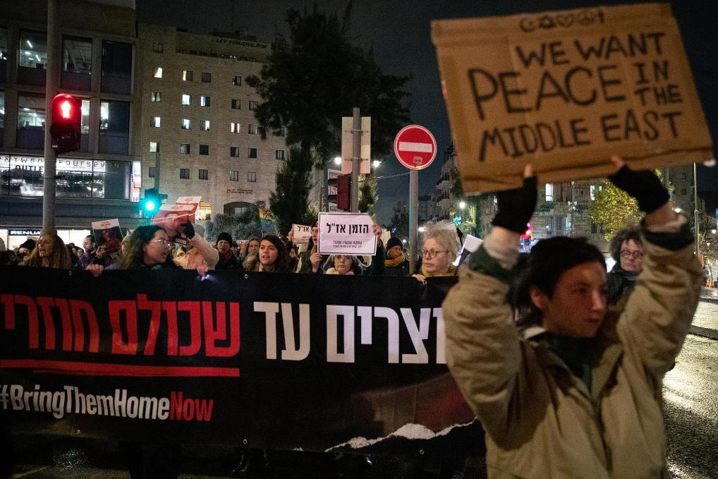 1月24日,人们在耶路撒冷街头参加游行。当日,部分民众在耶路撒冷举行游行,呼吁以色列政府在加沙停火止战,并尽快采取措施让被扣押在加沙地带人员获得释放。新华社记者陈君清摄