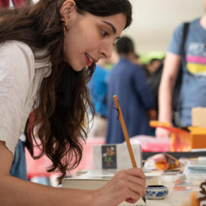 ↑2023年4月19日,参观者在巴西里约热内卢体验中国书法。