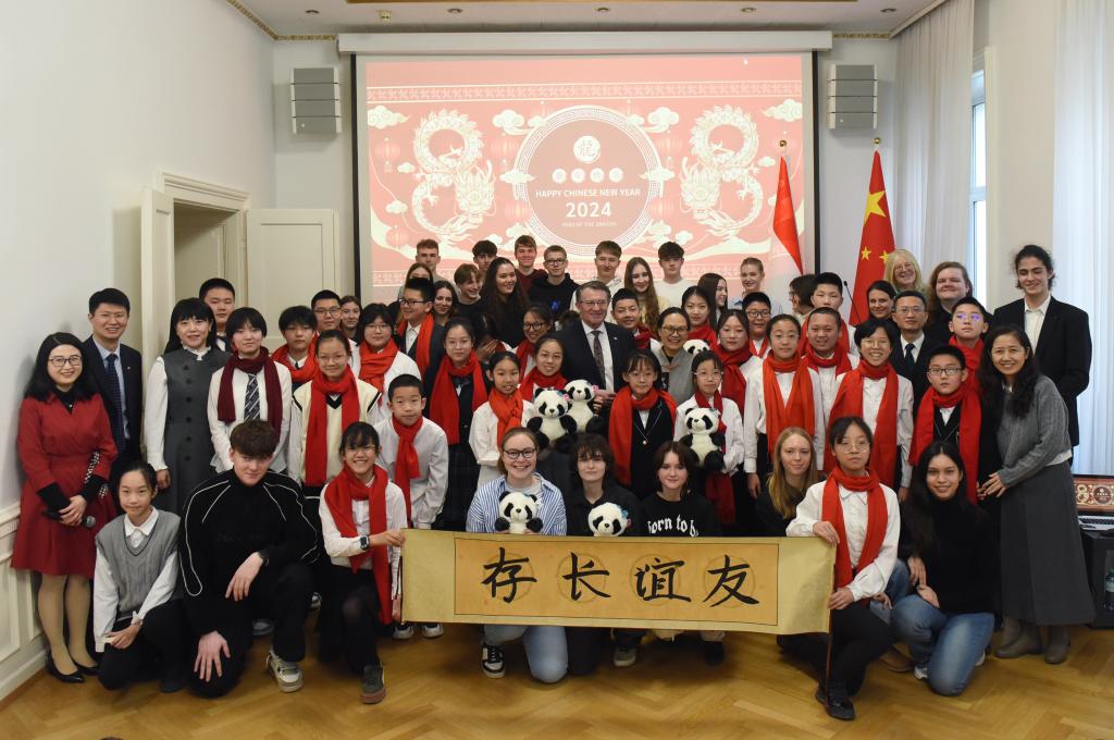 中国红灯笼与可爱的大熊猫、中国龙玩偶互相映衬,中国功夫、民族舞表演引来满堂喝彩……位于奥地利首都维也纳的中国驻奥地利大使馆内洋溢着浓浓的中国年味。来自中国哈尔滨风华中学和奥地利维也纳新城辰纳联邦文理中学的60多名学生26日欢聚一堂,举办丰富多彩的活动,共迎中国龙年新春。