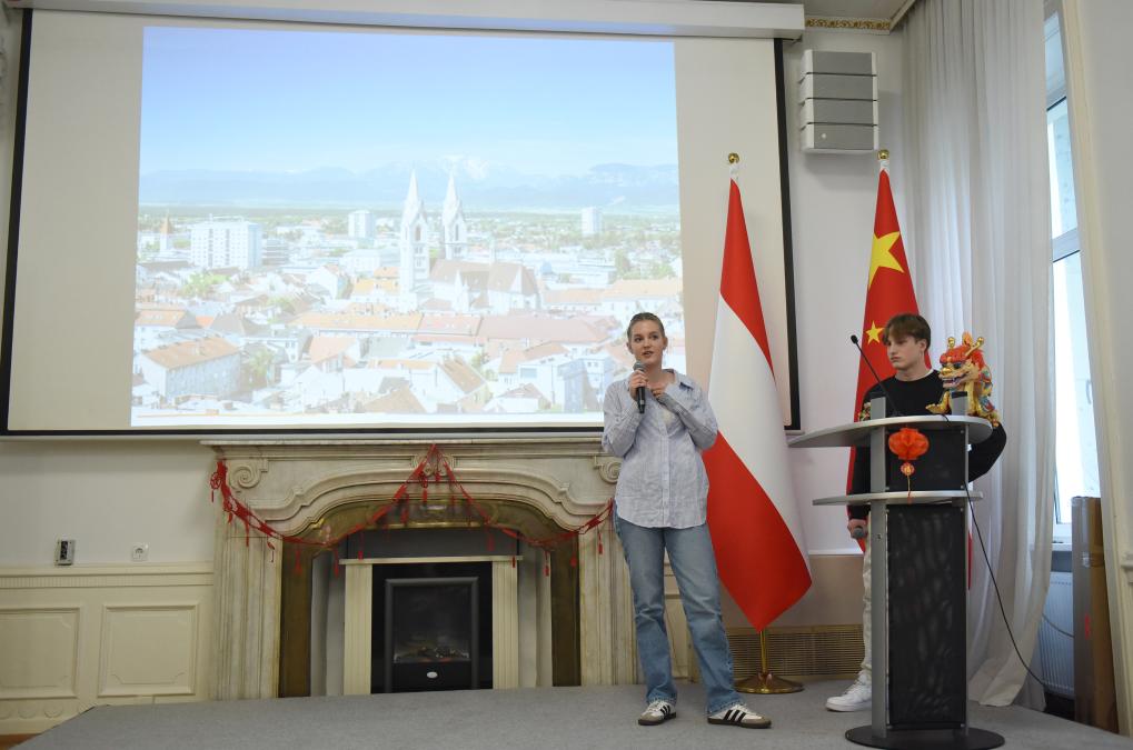 1月26日,在维也纳的中国驻奥地利大使馆,奥地利维也纳新城辰纳联邦文理中学学生在活动上介绍自己的城市和学校。新华社记者贺灿铃摄