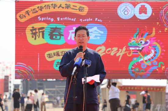 1月28日,在乌干达坎帕拉举行的龙年新春庙会上,中国驻乌干达大使张利忠讲话。阿佳拉·纳瓦达摄