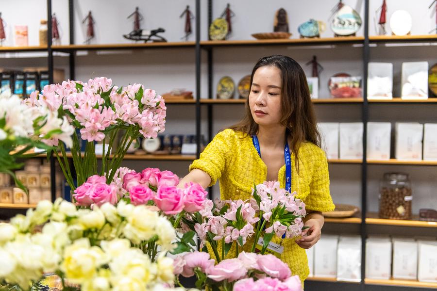 2023年7月1日,在位于湖南省长沙市的湖南高桥大市场,中非经贸博览会常设展馆展区肯尼亚馆工作人员在整理产自非洲的鲜花。新华社记者 陈思汗 摄