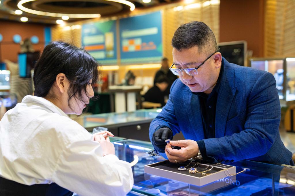 1月31日,在位于湖南长沙的中非经贸博览会常设展馆展区,南非馆负责人于洋(右)向消费者介绍进口首饰。新华社记者陈思汗 摄