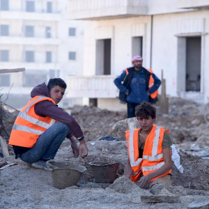1月24日,在叙利亚阿勒颇,工人在当地安置房施工现场作业。