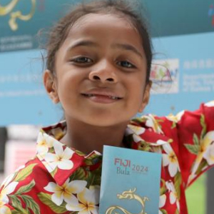 2月3日,在斐济举行的中国农历龙年生肖邮票及首日封发行仪式上,一名斐济儿童在中国农历龙年生肖邮票介绍展板前留影。新华社发(桑钦龙摄)pagebreak